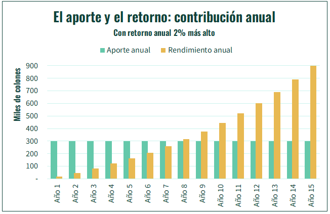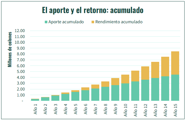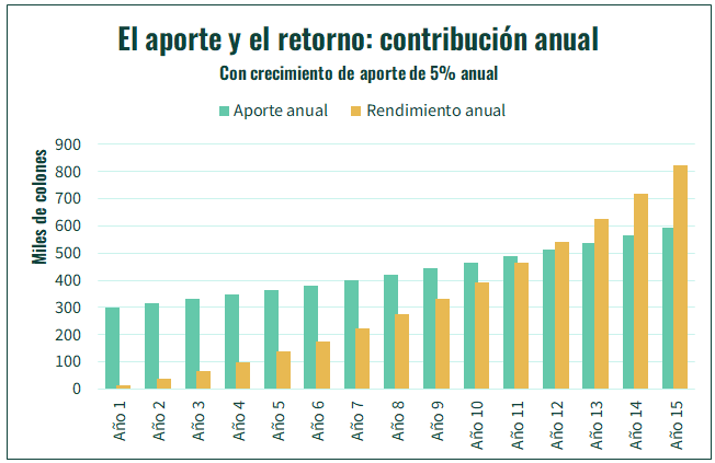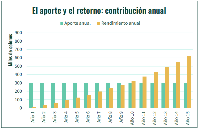 Durante los primeros años, el capital de inversionista crece, principalmente, por el aporte. Por ejemplo, el primer año, el capital crece ₡310 000 colones; ₡300 000 por aportes y ₡10 000 por retornos. Estos ₡10 000 difícilmente cubran el costo del tiempo invertido en buscar mejores opciones de inversión.