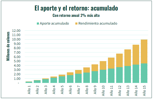 Y sí, con un retorno más alto, de 10%, vemos un crecimiento más acelerado de los montos, tanto del de rendimiento anual, como del acumulado. Con un rendimiento de 10% alcanzamos casi ₡10 millones luego de 15 años, contra los ₡8.5 millones a los que se llega con un 8% de rendimiento.