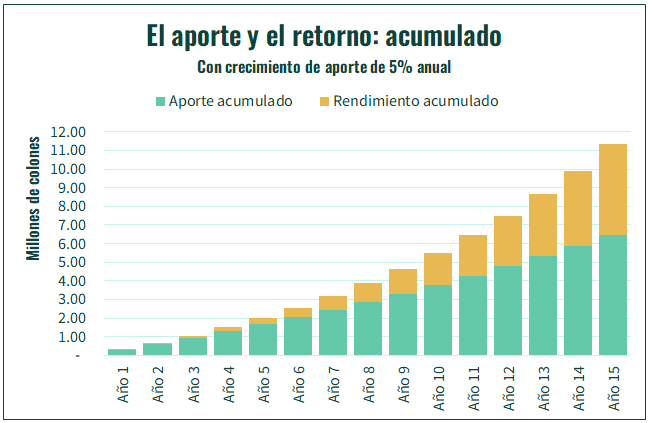 Pero esta no es toda la historia. ¿Qué pasaría en cambio si nos mantenemos con el retorno de 8%, pero aumentamos en un 5% nuestro aporte todos los años? En este caso, vemos un crecimiento aún más rápido de los acumulados, que al cabo de 15 años llegan a un nivel de ₡11.3 millones.