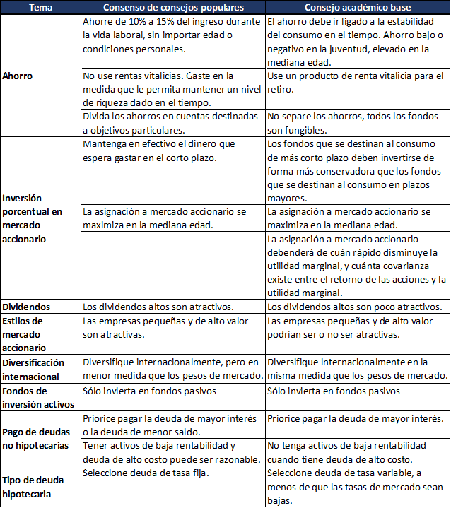 A continuación les presento la traducción del principal cuadro del informe, que resume y compara, para una serie de decisiones, la recomendación más común en los libros de finanzas personales y la recomendación esperada al consultar la literatura académica.