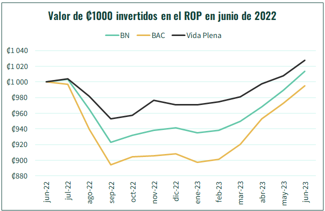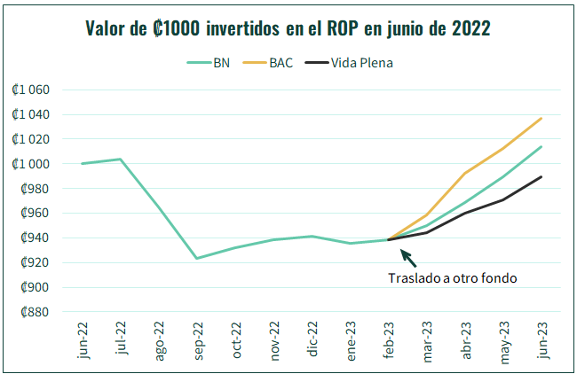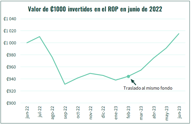 Imaginemos entonces un caso sencillo en el que uno sale de un fondo para volver a entrar a él. En el siguiente gráfico presento como escenario el promedio para la industria el último año. Si uno hubiera tenido 1000 colones en un fondo promedio al cierre de junio del año 2022, ya para el cierre de junio de 2023 habría registrado un incremento en su valor cercano al 2%. Pero, ¿cuál sería la consecuencia de haber realizado el traslado durante la parte del año en la que el valor se encontraba por debajo de los 1000 colones?