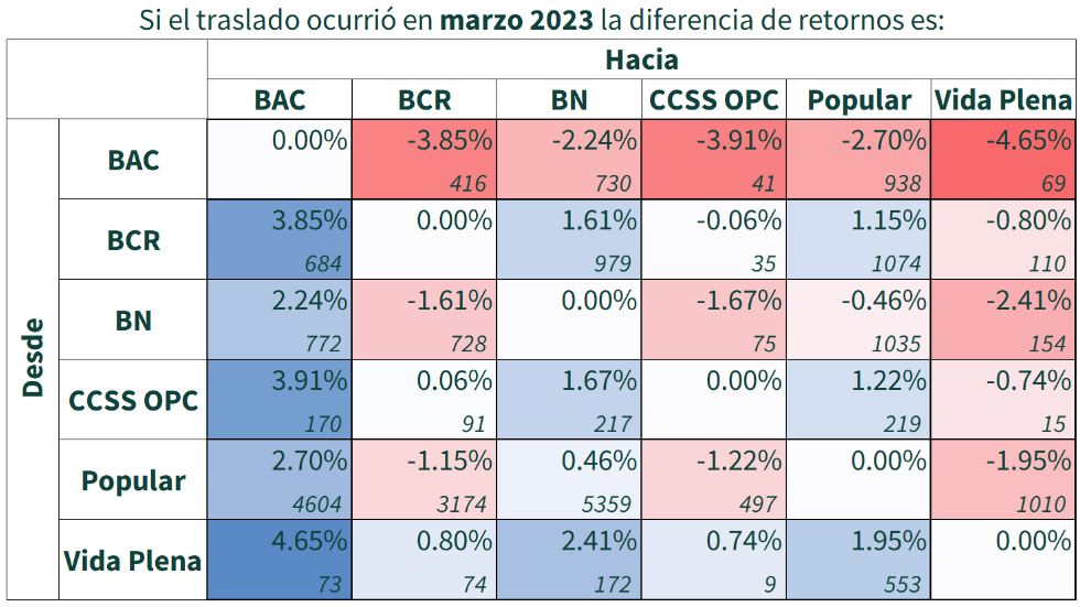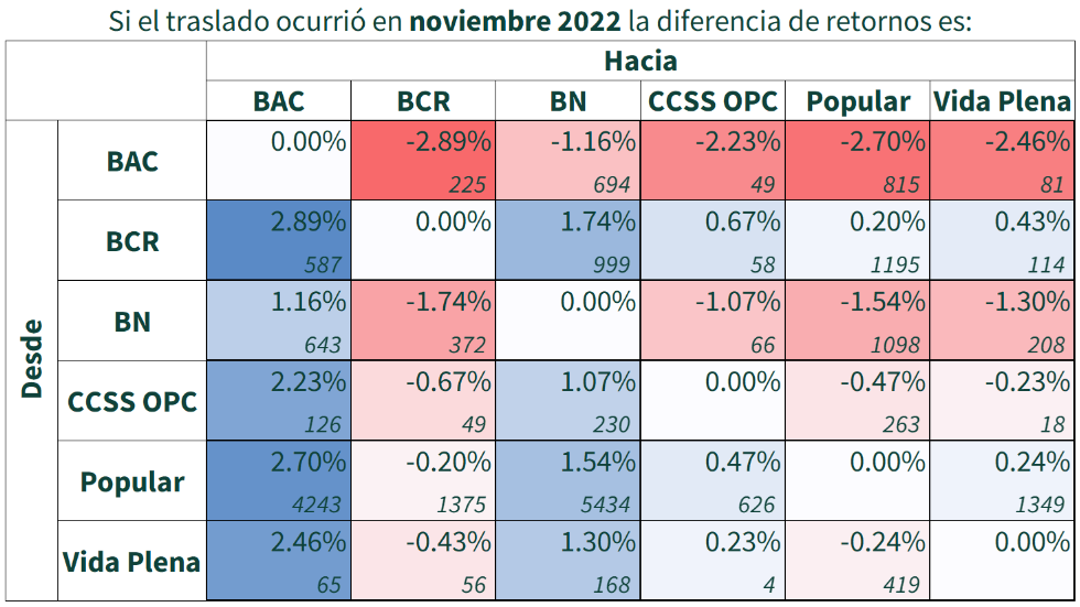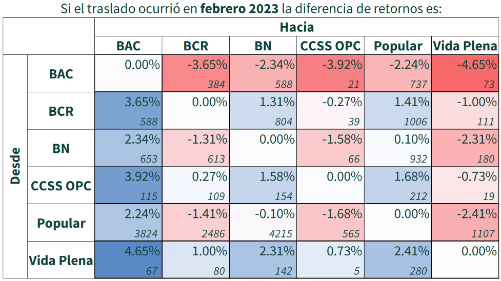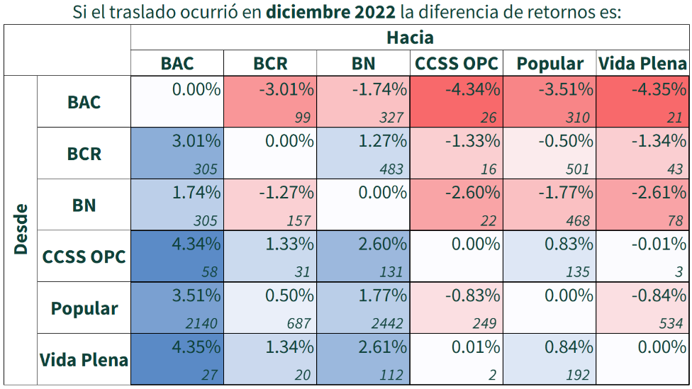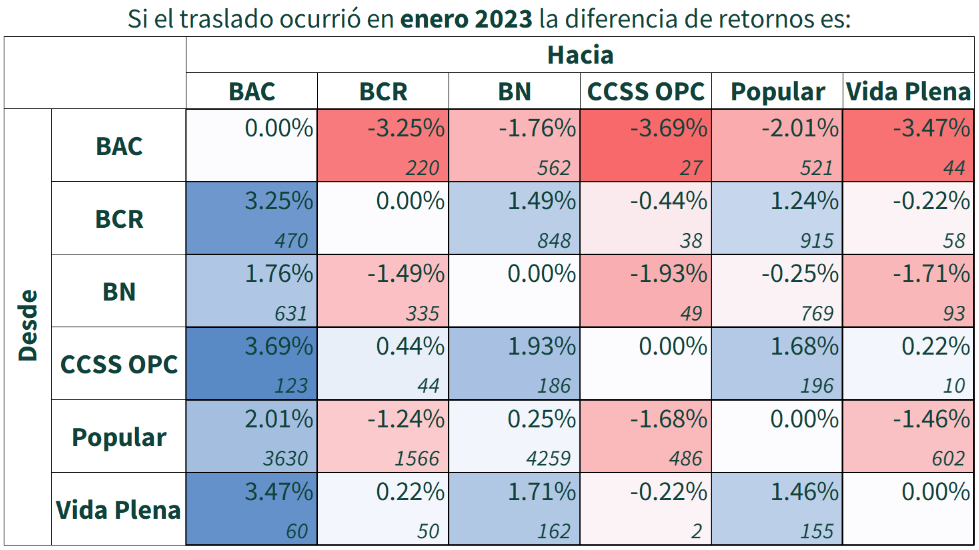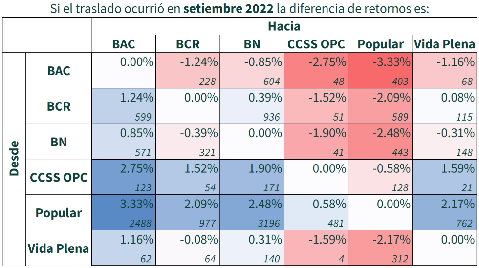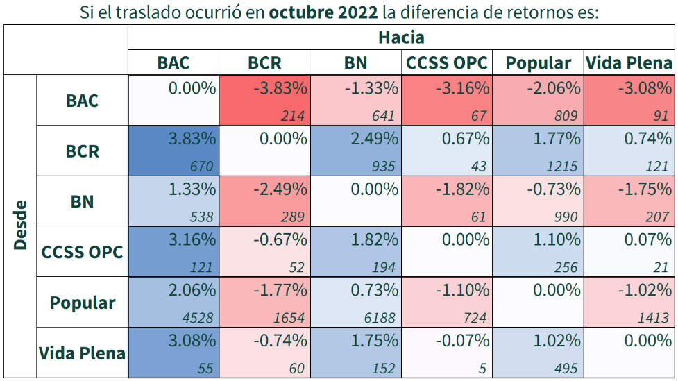 En esta tabla, podemos ver el efecto sobre el retorno (desde el momento del cambio hasta hoy) de haber hecho traslados desde y hacia cada una de las operadoras. Así, por ejemplo, alguien que se pasara desde la OPC de la CCSS hacia la OPC del BCR en el mes de setiembre, habría acumulado un 1.52% adicional de retorno por esta decisión, mientras alguien que hiciera lo contrario, habría perdido 1.52%.2