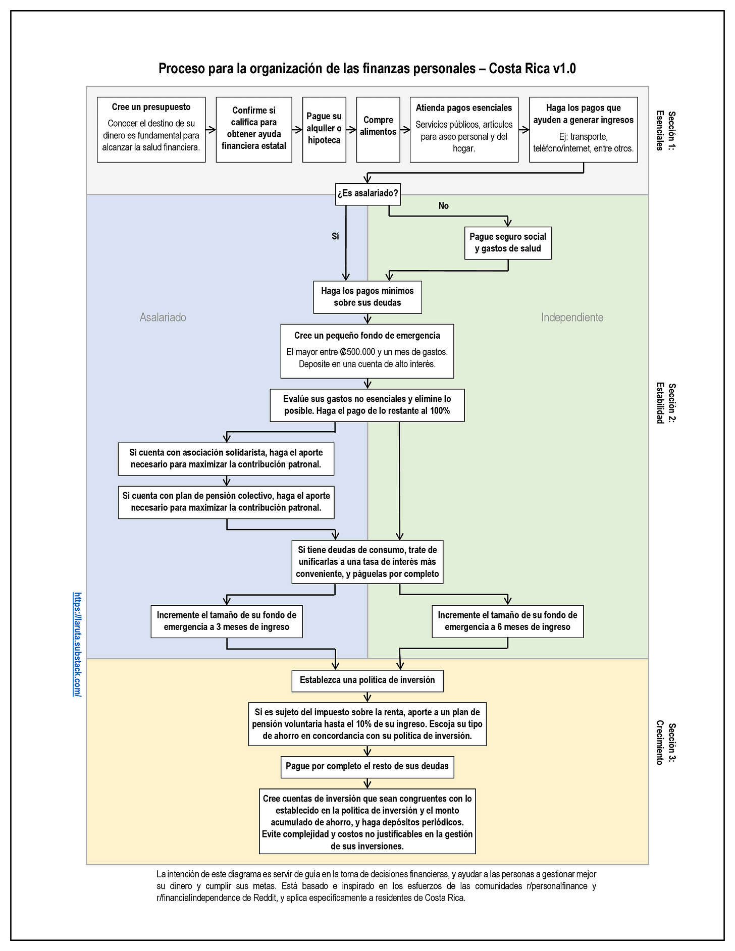 Sabiendo esto, quise arrancar con una publicación resumen que sirviera de referencia integral a quienes estén en Costa Rica y quieran iniciar por este camino del ahorro y la inversión. El diagrama de flujo que vemos arriba es el resultado de este esfuerzo. Contiene la lista de pasos a seguir para alcanzar nuestros objetivos aprovechando al máximo las oportunidades existentes en el país.